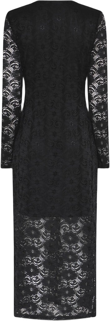 CastaneaBBOrra kjole er en elegant midi kjole i sort blonde med lange ærmer og en dyb V-halsudskæring. Design kombinerer sofistikeret gennemsigtighed med en figursyet silhuet. Style den med hæle og smykker til galla- eller aftenarrangementer, eller sæt de